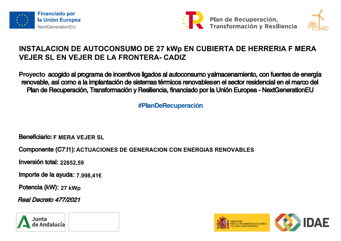 FMERA VEJER SL ha recibido una ayuda de la Unión Europea con cargo al Fondo NextGenerationEU, en el marco del Plan de Recuperación, Trasformación y Resiliencia, para (denominación de la actuación/proyecto) dentro del programa de incentivos ligados al autoconsumo y almacenamiento, con fuentes de energía renovable, así como la implantación de sistemas térmicos renovables en el sector residencial del Ministerio para la Transición Ecológica y el Reto Demográfico, gestionado por la Junta de Andalucía, a través de la Agencia Andaluza de la Energía”.